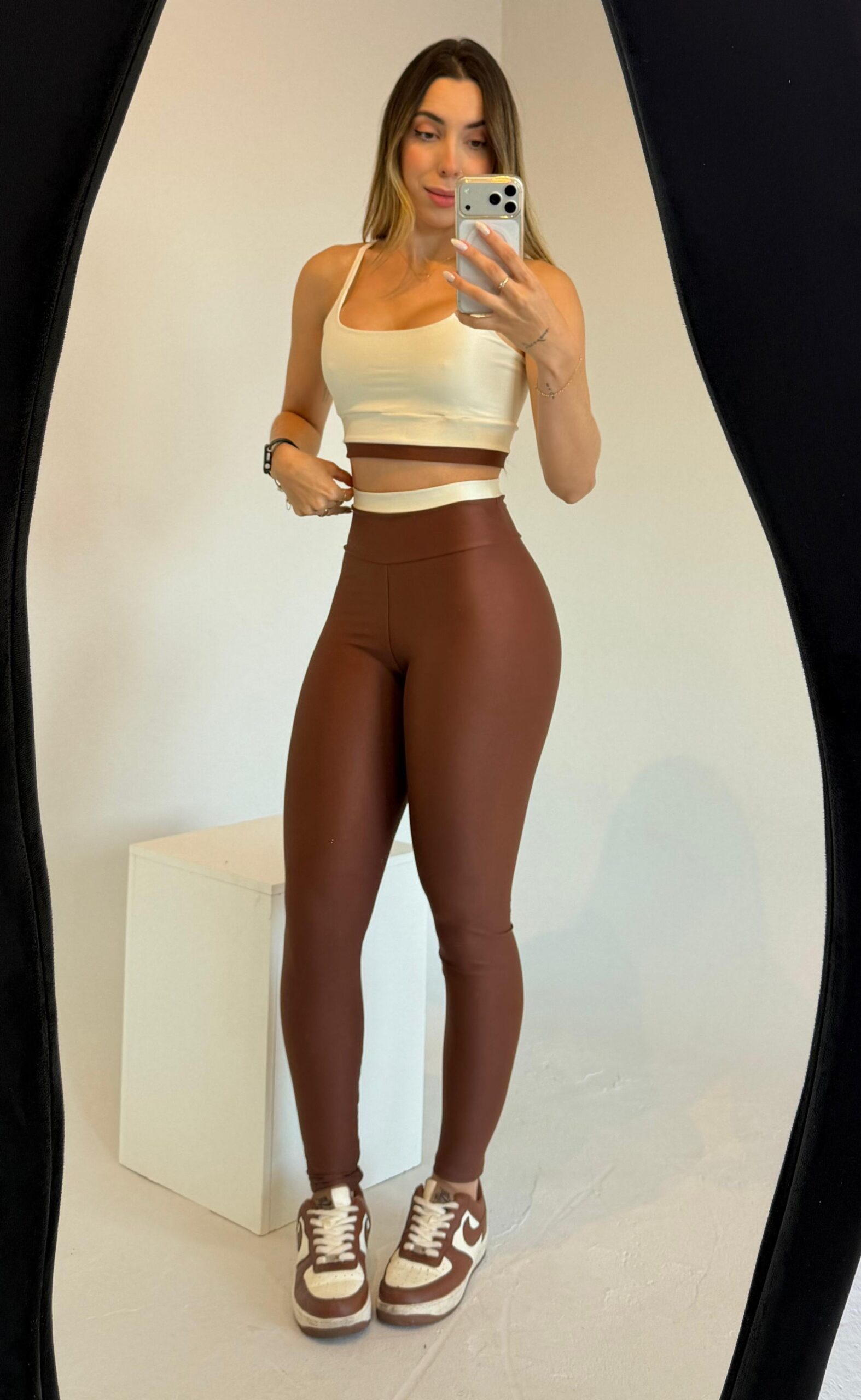 O top possui alças finas e delicadas, com design minimalista que valoriza o colo e garante sustentação confortável, ideal tanto para treinos quanto para composições no estilo athleisure.