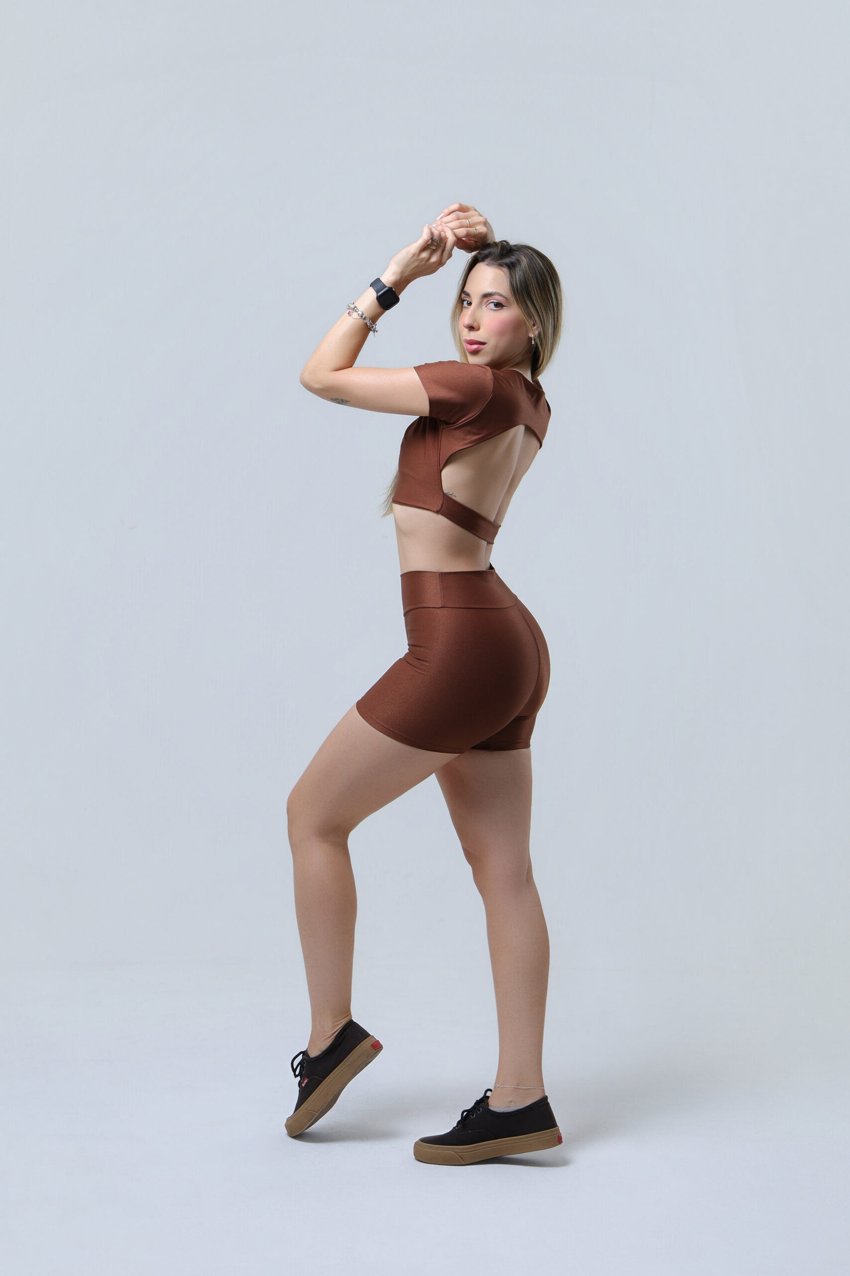 O conjunto é composto por short e Cropped de manga curta, com modelagem confortável que acompanha os movimentos. A blusa possui detalhe aberto nas costas, trazendo um charme especial e um visual mais leve e estiloso para o look.
