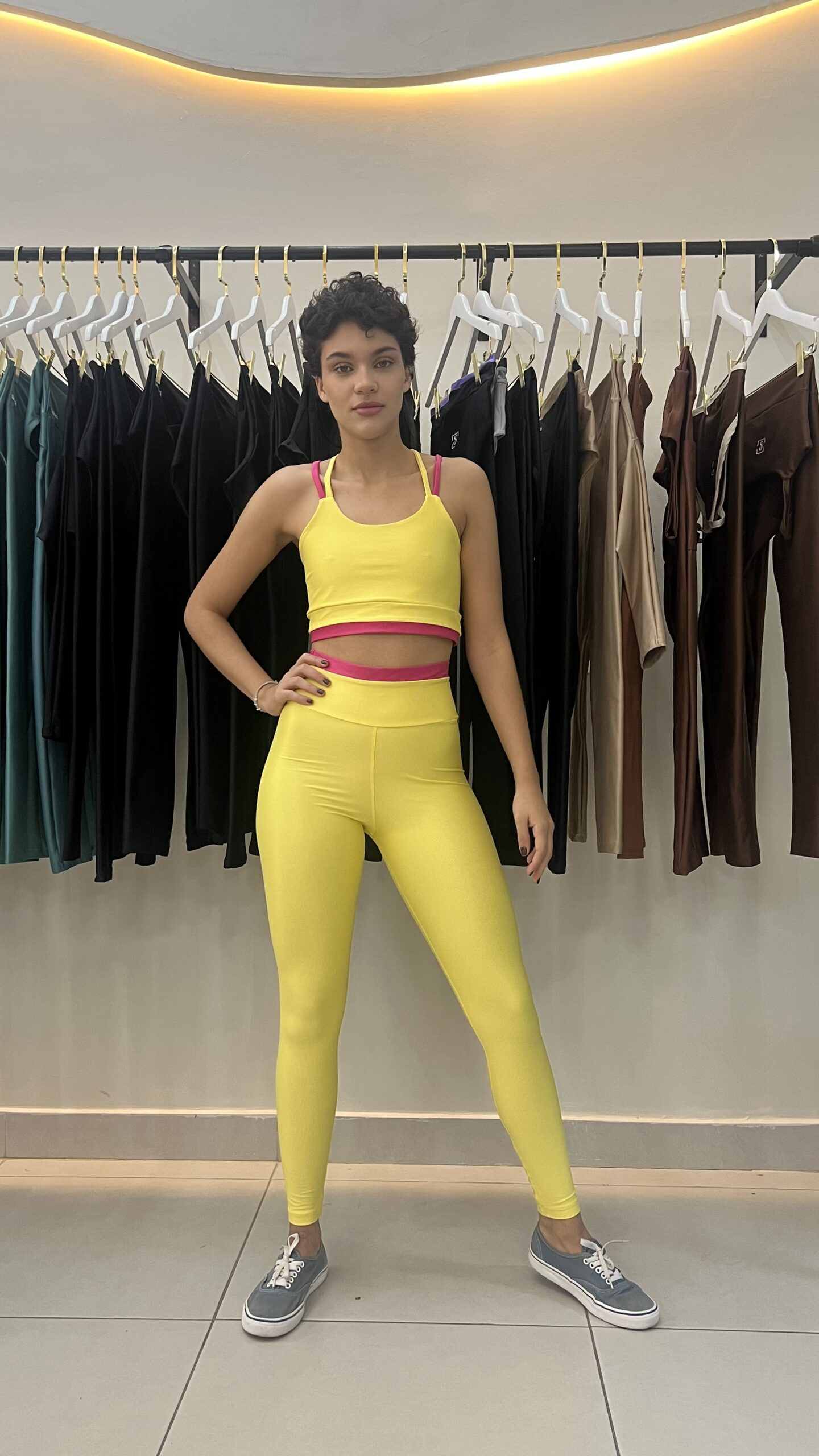 Com top alças finas e modelagem que valoriza o busto, ele oferece sustentação ideal para treinos ou uso casual. Tecido acetinado traz um contraste elegante, calça com cós alto que modela a cintura e garante segurança e conforto durante todo o uso.