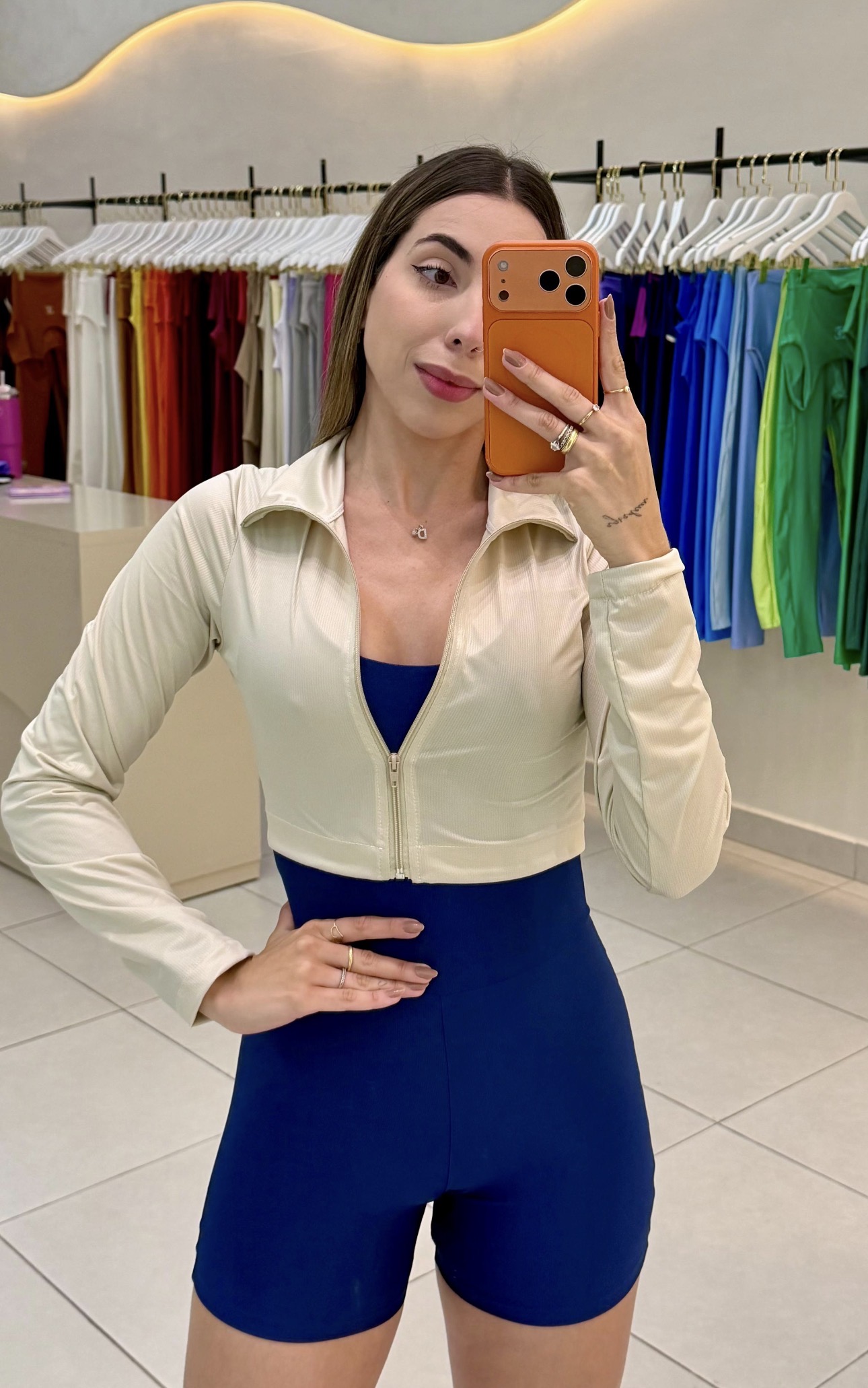 Seu modelo cropped traz um toque atual e valoriza a silhueta, enquanto o zíper frontal garante praticidade na hora de vestir e ajustar a peça.